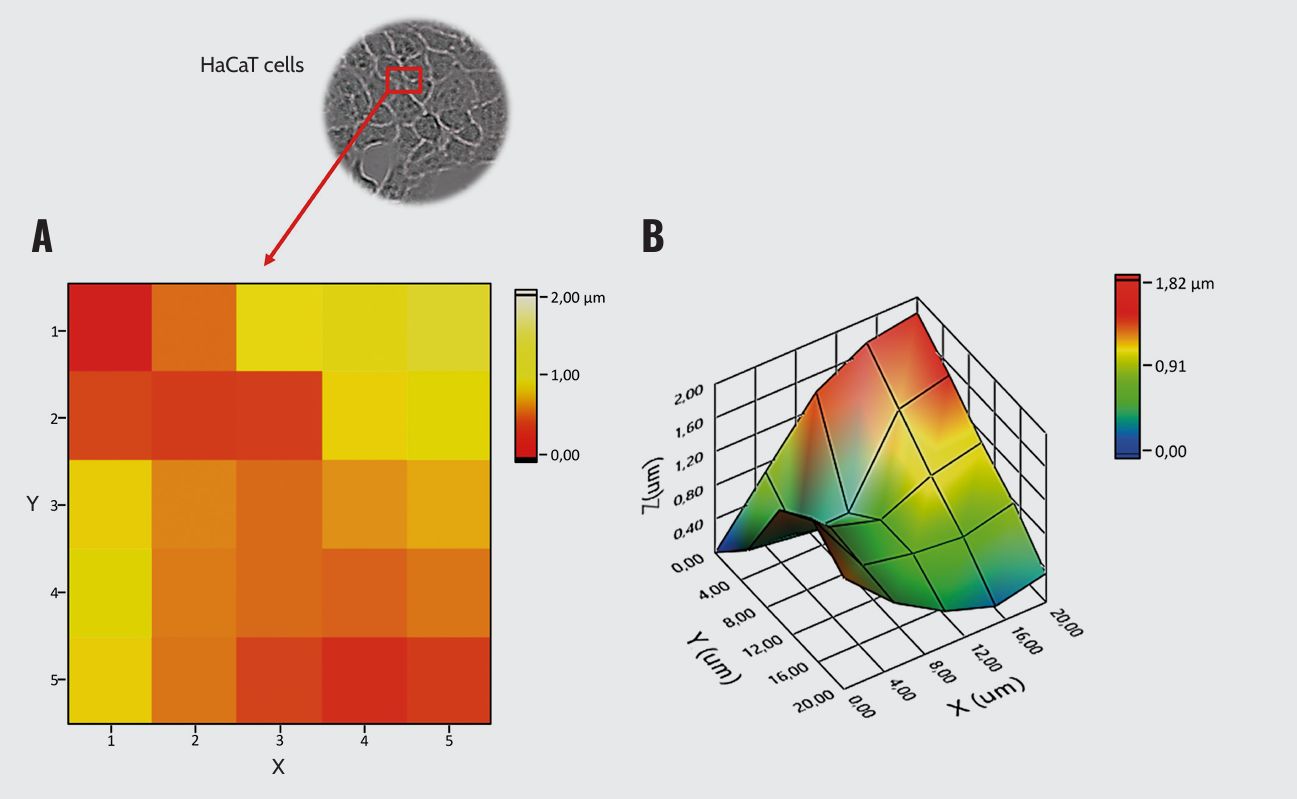 HaCaT cells topography. (A) 2D surface plot and (B) 3D surface topography.