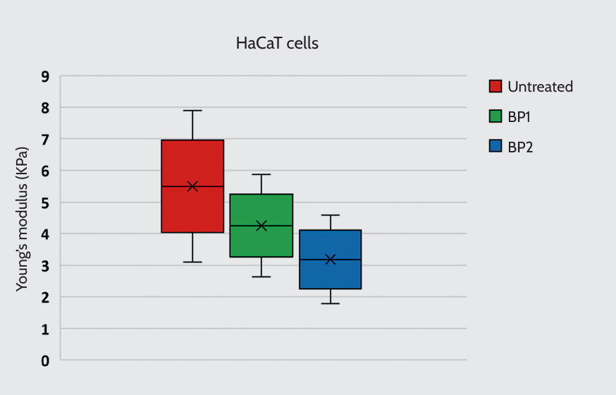 Young’s modulus of HaCaT cells. Cells were treated with two bioactive peptides (BP): BP1 (5 μg/ml) or BP2 (0.5 μg/ml). Untreated cells were included as a control.