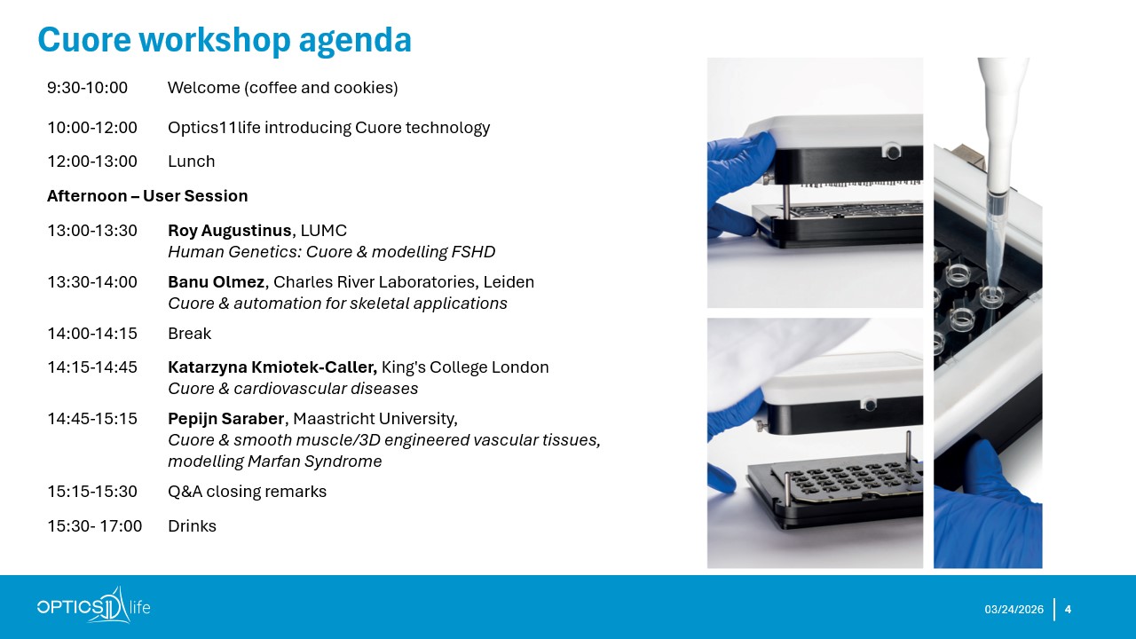 This workshop is built to give attendees both a technical understanding of the Cuore platform and a broader view of how it is being applied in real research settings. During the morning, the Optics11 Life team will introduce the technology, demonstrate the system workflow, and present examples of generated data. In the afternoon, invited users will share application-driven insights from their own work.