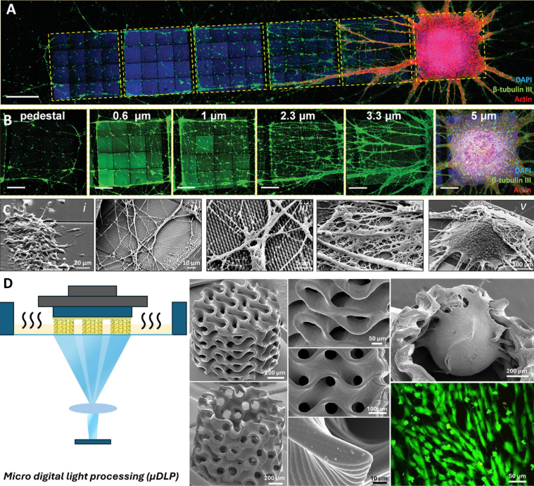 Figure 2. A-C: Neurosphere and neurites sprouting on nano-pillar arrays featuring tunable effective shear modulus5; D: µDLP fabrication of PEGDA/GelMA hydrogel meso-scale scaffolds for hybrid scaffold-free/scaffold-based neural organoid culture6.