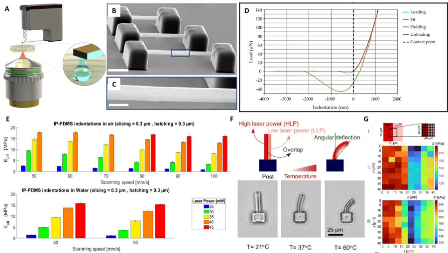 Figure 1. A: Schematic of 2PP fabrication and optical interferometry-based nanoindentation of soft biomaterials; B,C: SEM micrographs of 2PP-printed IP-PDMS beams3; D: Typical load/indentation plot with Hertzian fit3; E: Influence of the scanning speed on the effective Young’s modulus of IP-PDMS in air and water3; F: Schematic drawing showing the bending of a 4D-printed bilayer beam from a single material (i.e., pNIPAM hydrogel) and its angular deflection at different temperatures of 21 °C, 37 °C, and 60 °C4; G: YM measurements across the bilayer 2PP printed pNIPAM hydrogel beam4.