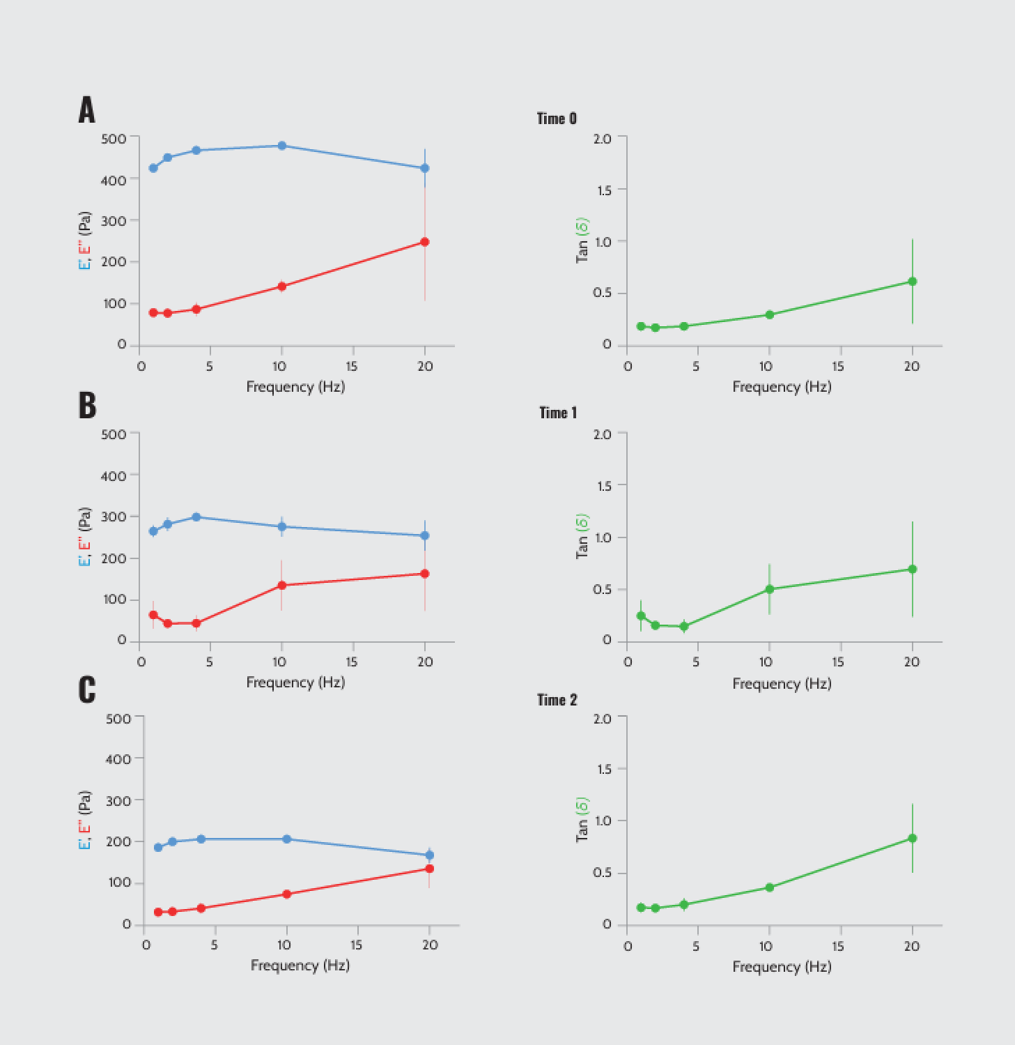 Dynamic mechanical analysis of batch 1 (9.8 mg/ml) as a function of frequency. (A–C) Storage modulus (E’), loss modulus (E’’), and loss or damping factor tan (δ) (E’/E’’) at time 0, 1 (after 1 h), and 2 (after 2.5 h). (N = 3).