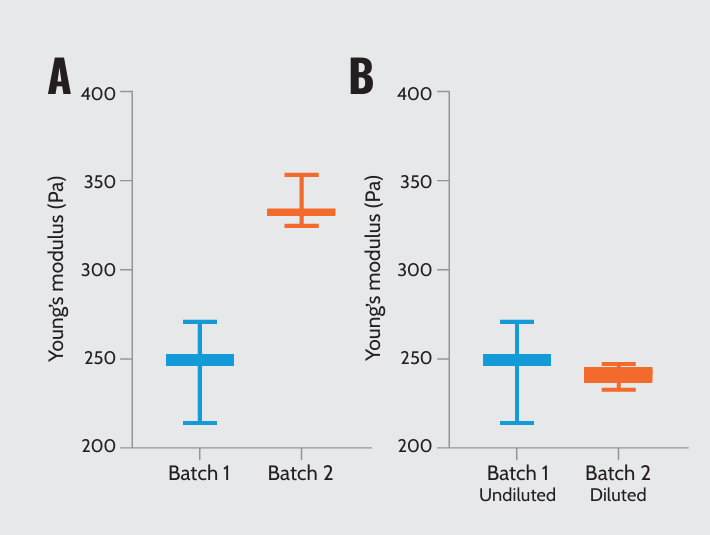 Matrigel’s mechanical properties by varying batches and protein concentrations. (A) Young’s modulus of two Matrigel® batches: batch 1 (7.6 mg/ml) and batch 2 (9.8 mg/ml). (B) Young’s modulus of two Matrigel® batches with the same protein concentration (7.6 mg/ml): undiluted batch 1 and diluted batch 2.