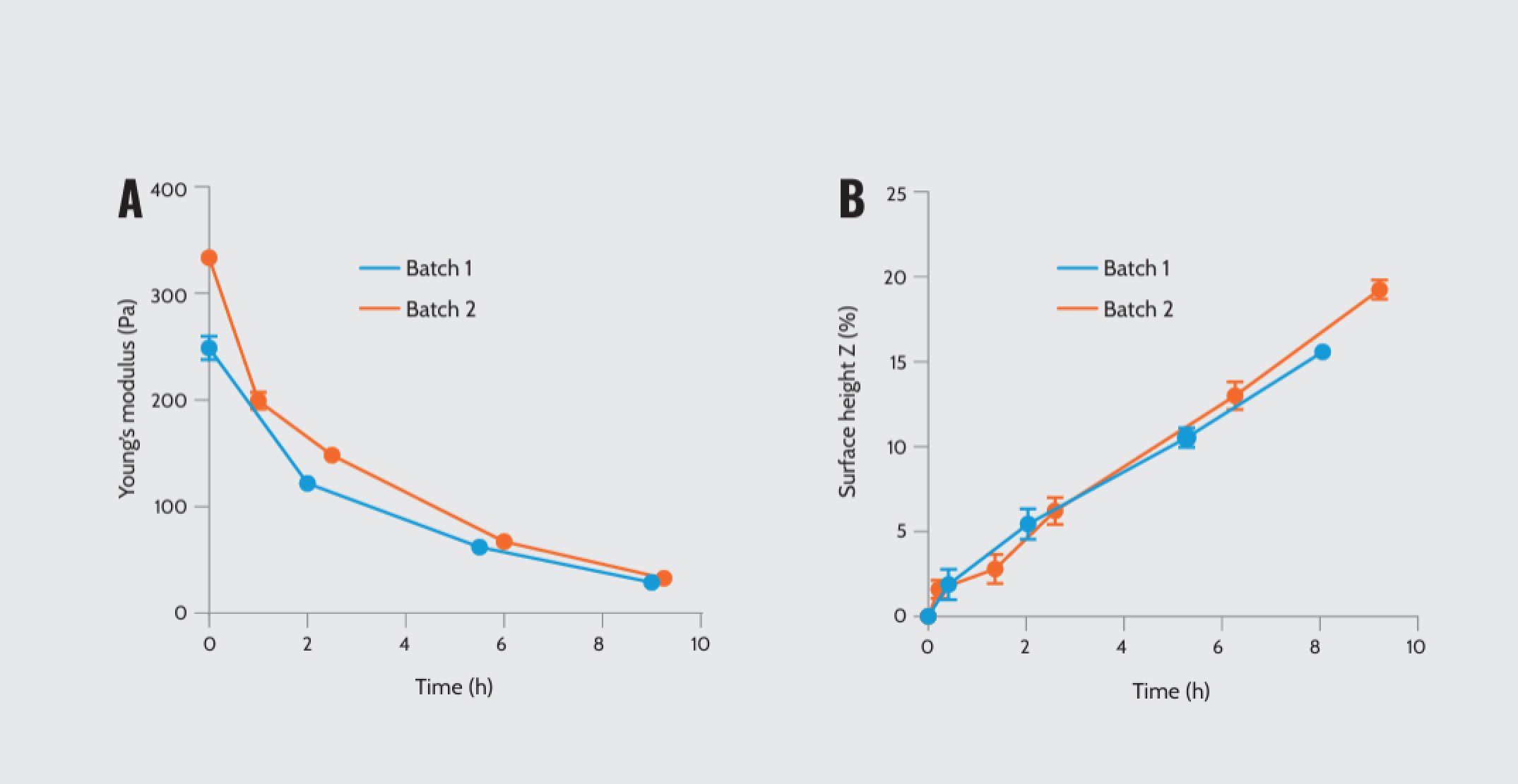 Mechanical properties of Matrigel® as a function of time. (A) Young’s modulus of two Matrigel® batches with different protein concentrations over time: batch 1 (7.6 mg/ml) and batch 2 (9.8 mg/ml). (B) Matrigel swelling analyses by plotting the height difference over time.
