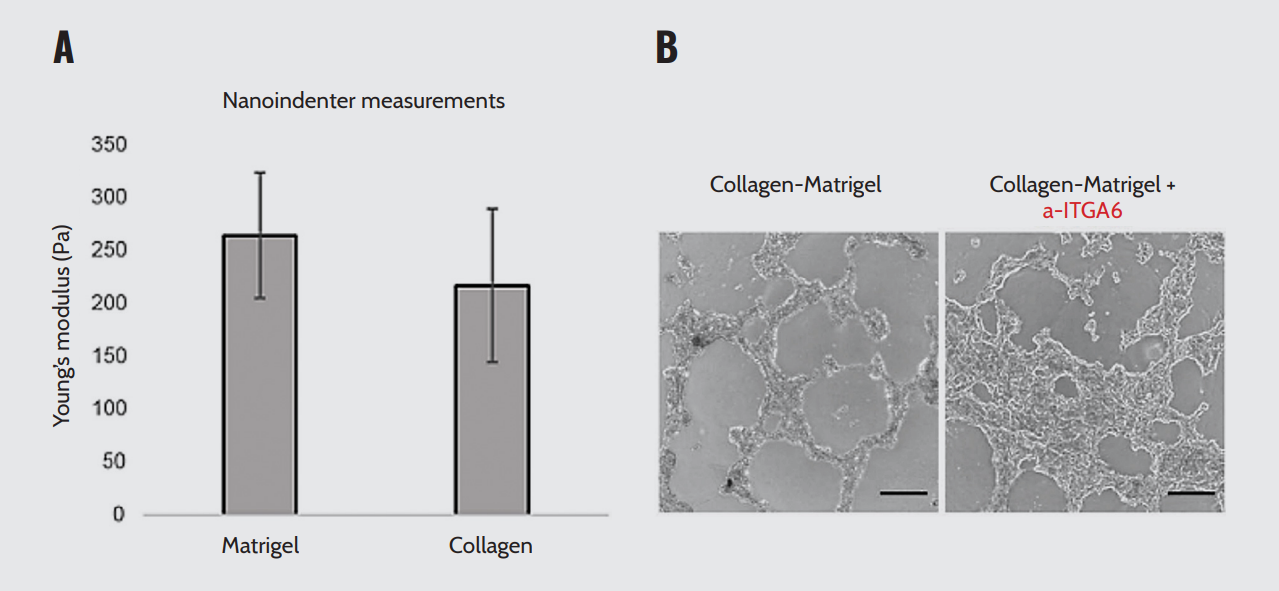 Their findings revealed that collagen type I concentration has a stiffness similar to Matrigel (Figure 1A). They also demonstrated that changing ECM components while maintaining a similar stiffness affects the epithelium via laminin signaling through the ITGA6 receptor (Figure 1B). Blocking ITGA6 diminished the induced morphological changes and prevented the upregulation of intestinal stem cell genes. Overall, Optics11 Life technology allowed the researchers to compare ECM with similar stiffness and conclude that ECM composition influences the behavior of the intestinal epithelium.