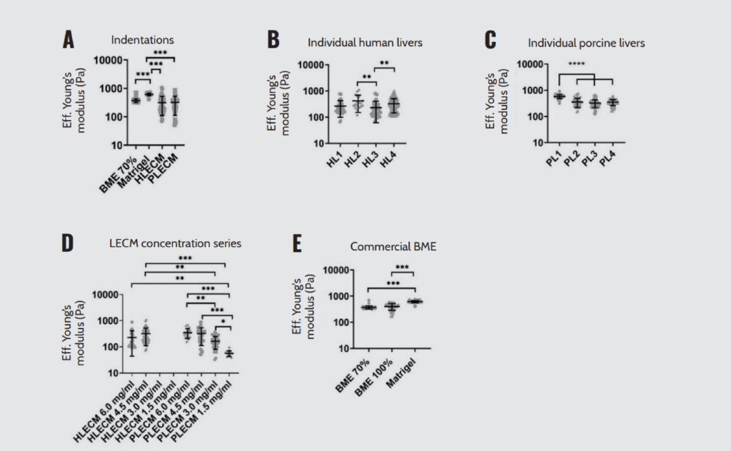 Nanoindentation experiments revealed no significant differences between the Young’s modulus of PLECM and HLECM (Figure 3A). However, Matrigel showed a significantly higher Young’s modulus than LECM and BME 70%. Moreover, increasing the concentration of the PLECM and HLECM hydrogels (6 mg/ml) did not yield an increased effective Young’s modulus (Figure 3D), indicating less efficient solidification of the LECM hydrogels at higher concentrations. No significant differences were found between PLECM and HLECM at similar concentrations (6.0 mg/ml and 4.5 mg/ml). Additionally, these hydrogels support the proliferation of cholangiocyte organoids and maintain the cholangiocyte-like phenotype. In conclusion, they found that liver ECM hydrogels can successfully replace tumor-derived BME and unlock the full clinical potential of human cholangiocyte organoids. Optics11 Life technology has helped researchers evaluate and select hydrogels with adequate stiffness for cholangiocyte organoid culture and expansion.