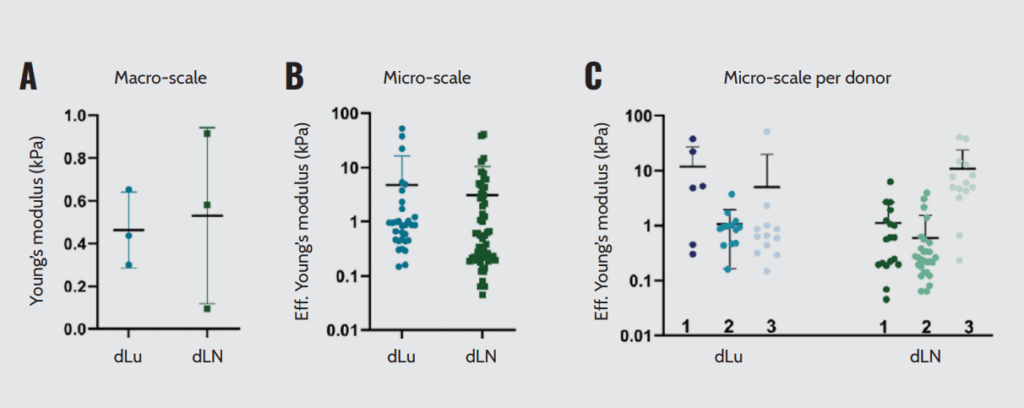 They found that macro- and microscale mechanical properties, as determined by rheology and microindentation, revealed local heterogeneity of the ECM. While dLu and dLN have similar stiffness, the macroscale stiffness of dLN has higher heterogeneity (Figure 4A). On a microscale, the stiffness values ranged from 0.15–52.3 kPa for dLu and 0.05–40.9 kPa for dLN (Figure 4B). Effective Young’s modulus split per donor for both dLu and dLN showed no significant differences (Figure 4C).