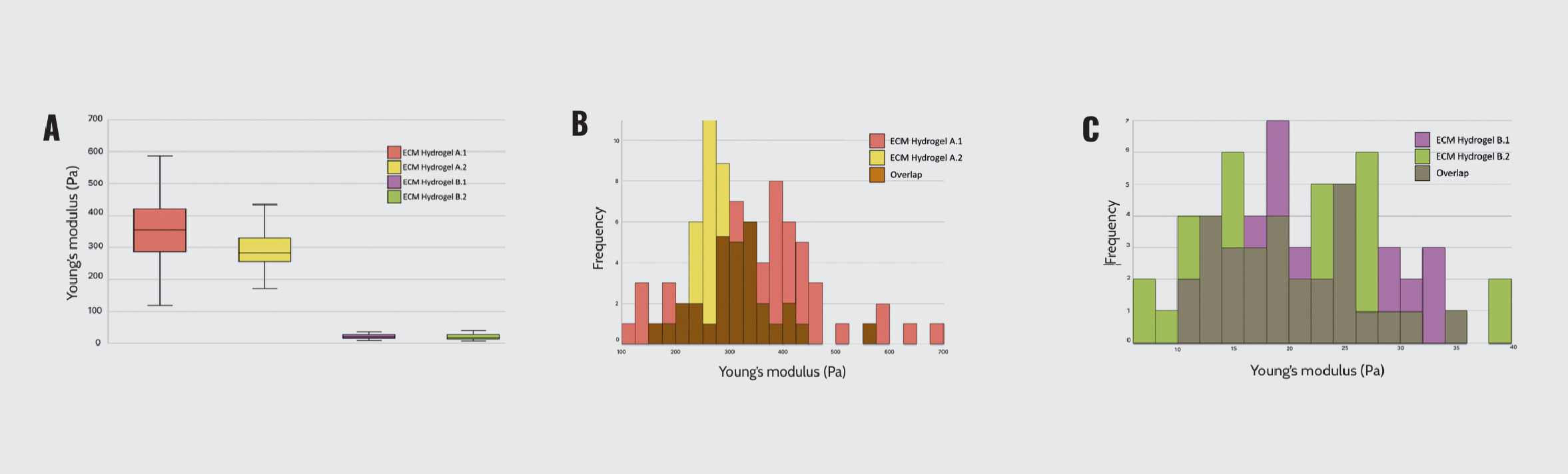 Mechanical characterization of lung-derived ECM hydrogels. (A) Young’s modulus of ECM hydrogels A and B. (B) Mechanical profile of ECM hydrogel A duplicates. (C) Mechanical profile of ECM hydrogel B duplicates.