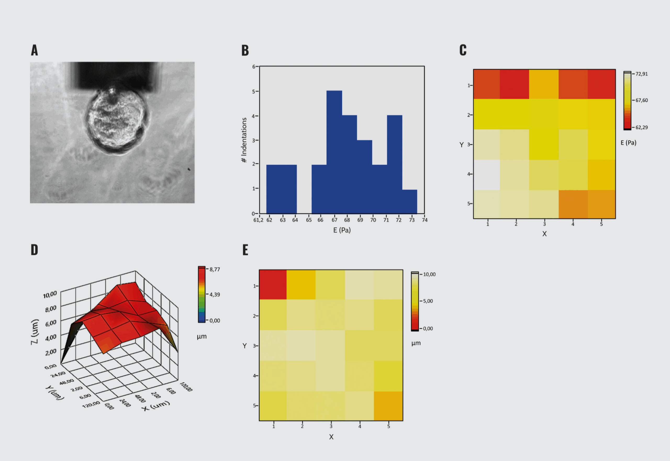 Mechanical characterization of organoids with Pavone. (A) Indentation of organoids. (B) Histogram of Young’s modulus distribution. (C) 2D Young’s modulus heat map. (D) 3D surface topography. (E) 2D surface plot. The graphical representations are generated by the DataViewer.