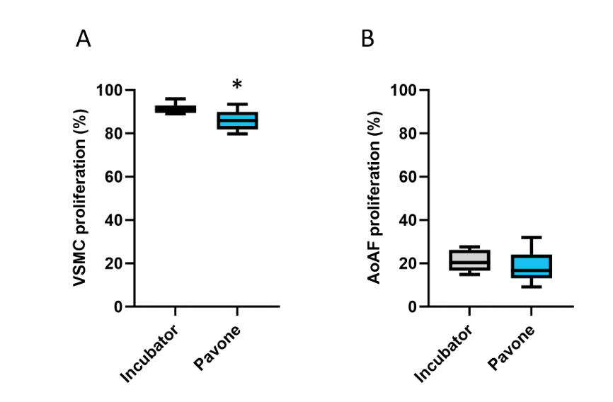 Vascular smooth muscle cells (VSMCs) were cultured in Dulbecco’s Modified Eagle Medium (DMEM) GlutaMAX supplemented with 1% penicillin/streptomycin (P/S), while primary aortic adventitial fibroblasts (AoAFs) were cultured in M199 supplemented with 1% P/S and 1% Fungizone. Cells were seeded in parallel in 48-well plates and maintained in a standard incubator or a Pavone system equipped with an Environmental Control Module, set to 37°C with 5% CO₂ and 95% humidity. Proliferative and apoptotic cells were assessed following overnight incubation (16 h).