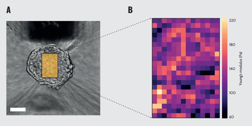 We circumvented these restrictions by culturing prostate cancer spheroids in SP5D. Owing to their geometry and surface (Fig. 1), SP5Ds gently encase the spheroids, thus containing their movement. By selecting a region of interest spanning a large portion of a spheroid, we mapped the distribution of Young’s modulus values in space (Fig. 2).