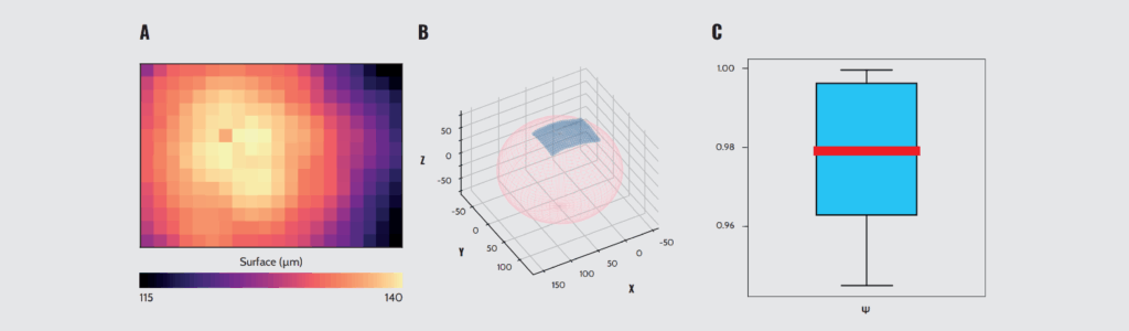 Quantification of the sphericity of spheroids. (A) Representative result of topographic characterization of a spheroid. (B) 3D representation of the spheroid topography (blue) and ellipsoid reconstruction (pink). (C) Boxplot with the sphericity (Ψ) calculation results for a subset of the measured spheroids (N = 6).