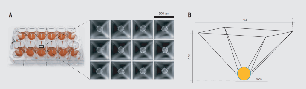 Typically, spheroids are manufactured using U-bottom, non-adhesive tissue culture plates or methods such as hanging drop or liquid overlay5. Regardless of the method, current approaches are relatively low throughput, require a considerable amount of work to be set up, and are incompatible with mechanical testing unless sample transfer and laborious preparations are involved6,7. For this reason, literature focused on the mechanics of spheroids, while showing extremely interesting results6,7,8,9,10, is currently held back by limited sample sizes (most of the cited studies analyze around 10 spheroids), especially when compared to equivalent studies conducted on 2D cultures11.