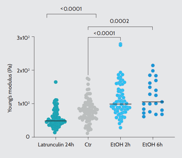 We treated the spheroids with Latrunculin B (Enzo) at a final concentration of 0.5 µM for 24 hours or ethanol (Supelco) 50 mM for 2 or 6 hours. We tested the effect of the treatments on the elastic modulus by comparing them to the control group. For all tests, we used a Kolmogorov–Smirnov test executed in GraphPad Prism.